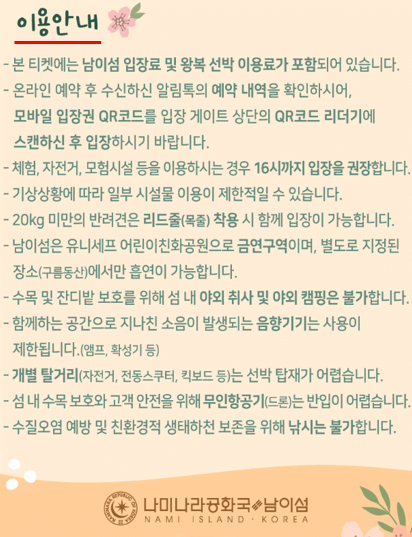 - 셔틀버스: 가평역에서 남이섬 선착장까지 셔틀버스 이용 가능