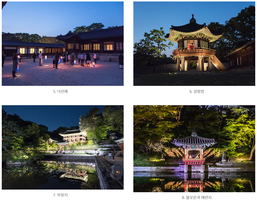 창덕궁 후원은 그 자체로 하나의 명소입니다. 달빛이 비추는 이곳을 산책하면서 고요하고 평화로운 분위기를 만끽할 수 있습니다.