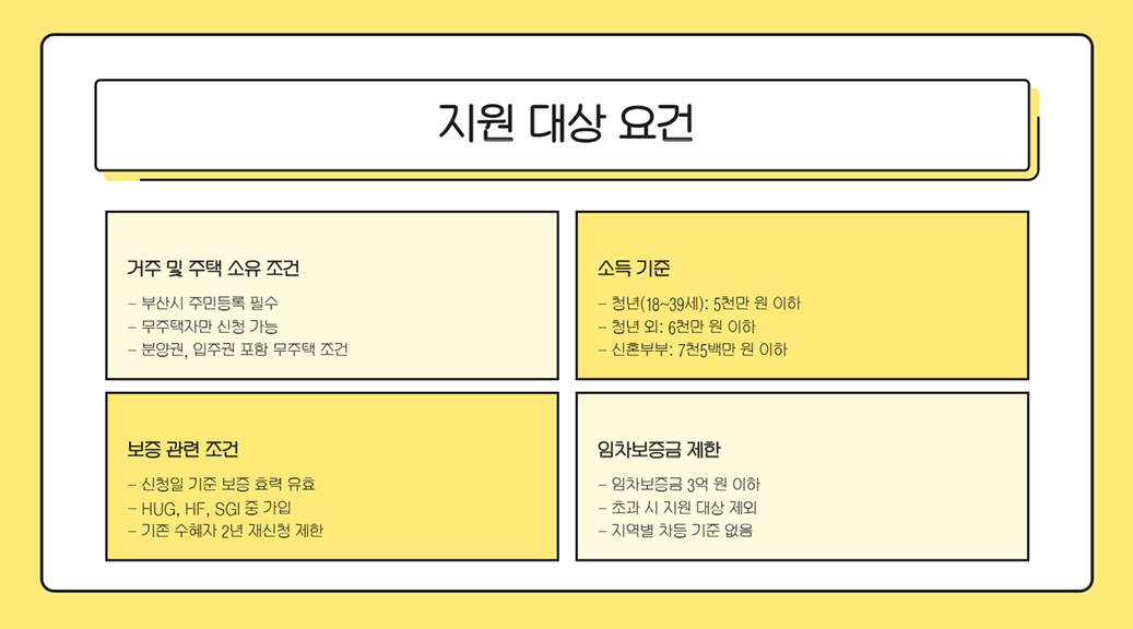 | 소득 기준 | 청년(18~39세): 5천만 원 이하 청년 외: 6천만 원 이하 신혼부부: 7천5백만 원 이하 |