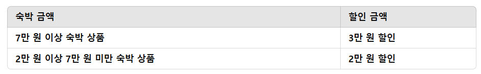 - 사용 가능 숙박시설: 호텔, 리조트, 펜션, 한옥, 콘도 등 등록 숙박시설